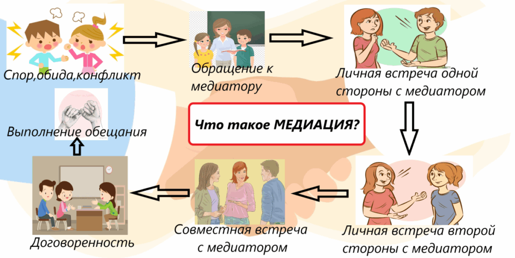 В процессе медиации каждый участник, как ребенок, так и взрослый, как обидчик, так и «жертва», может рассчитывать на то, что будет выслушан, услышан, его постараются понять, он сможет высказать свою позицию и видение ситуации, а также может предложить свою альтернативу разрешения конфликта. Такое общение в доверительной, уважительной обстановке, создается необходимое чувство безопасности, где может создаваться разрешение спора, где стороны могут прийти к соглашению, которое, скорее всего, будут склонны реализовывать, так как непосредственно участвовали в его создании.